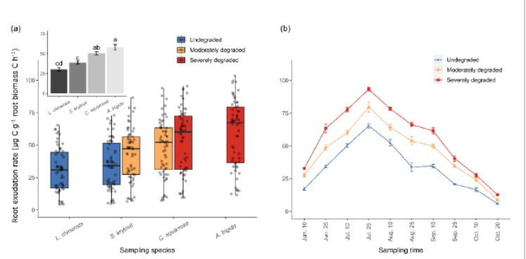 根系分泌物是指植物在生长发育过程中根系不同部位释放到根际环境的多种物质。由于根系分泌物具有浓度低、周转快等特点,且因研究技术手段的限制,导致很难准确测量根系分泌物量,使过去大多数关于量化土壤有机碳输入研究都忽略了根系分泌物的贡献。草原是重要陆地生态系统,由于长期过度放牧,造成草原退化日渐严重并伴随物种组成发生变化,阐明草原退化过程中不同物种根系分泌物变化及对土壤有机碳输入的贡献对理解草原生态系统碳循环具有重要意义。