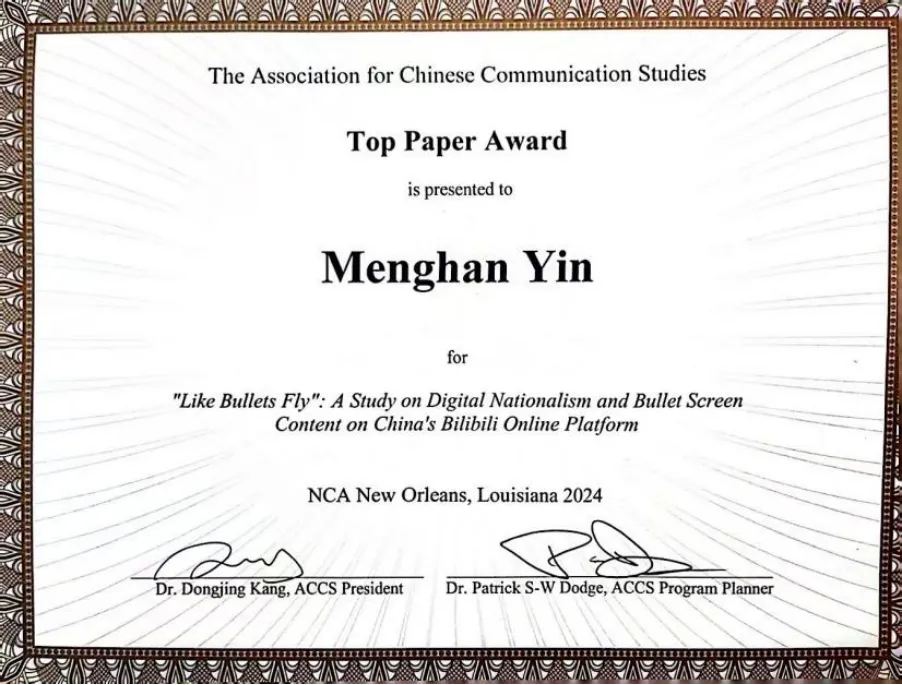 第110届全美传播学会(National Communication Association,NCA)年会于今年11月在美国新奥尔良市举行,大会主题是“Communication for Greater Regard”。尹梦涵提交的论文“‘Like Bullets Fly’: A Study on Digital Nationalism and Bullet Screen Content on China's Bilibili Online Platform”(“像子弹飞”:中国Bilibili网站上基于弹幕内容的网络民族主义研究)荣获NCA所属的中国传播研究协会(The Association of Chinese Communication Studies)颁发的最佳论文奖(Top Paper Award)。该项研究主要讨论了B站用户消费民族主义的情感表达方式,研究发现B站用户的话语表达体现了网络语言和官方语言的协商与合流,平台成为勾连地方性的情感共同体与政治共同体的“中间地带”。