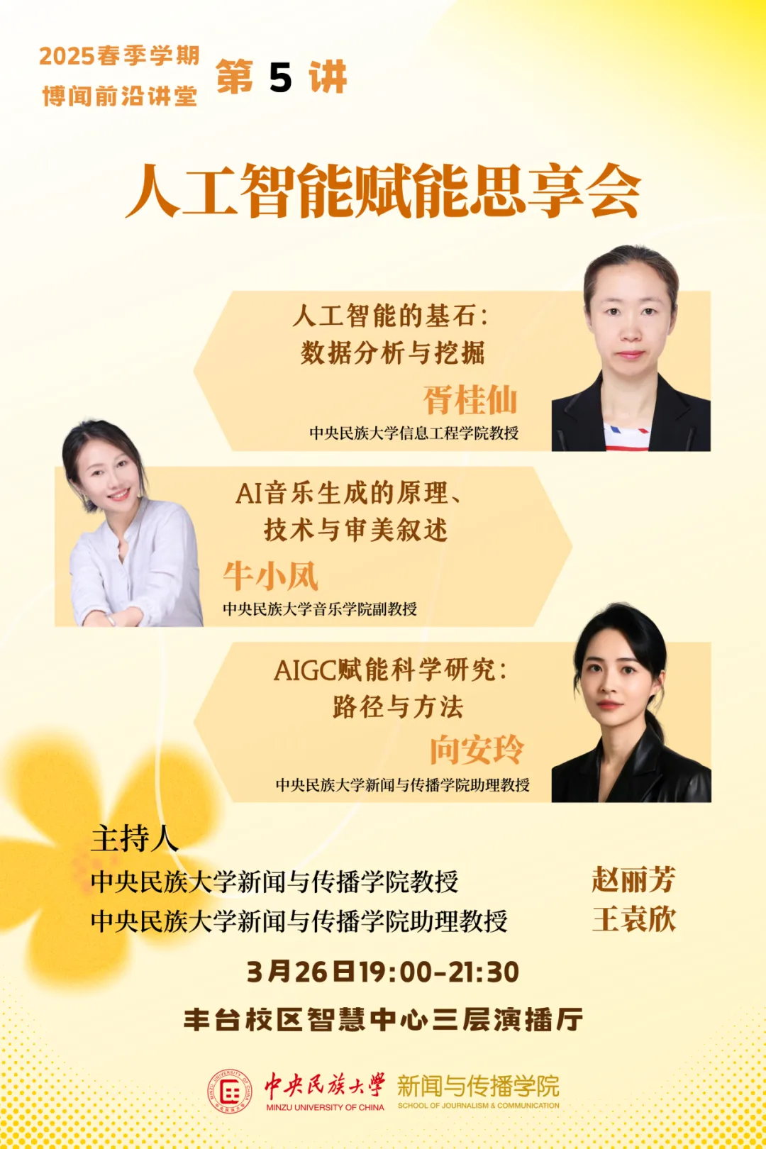新闻网讯  3月26日晚,由新闻与传播学院举办的2025春季学期博闻前沿讲堂第5讲暨第一期“人工智能赋能思享会”在丰台校区演播厅举行。信息工程学院教授胥桂仙、音乐学院副教授牛小凤、新闻与传播学院助理教授向安玲先后登台,以跨界视角揭秘AI技术逻辑,畅谈未来应用图景。各学院百余名师生现场参与。
