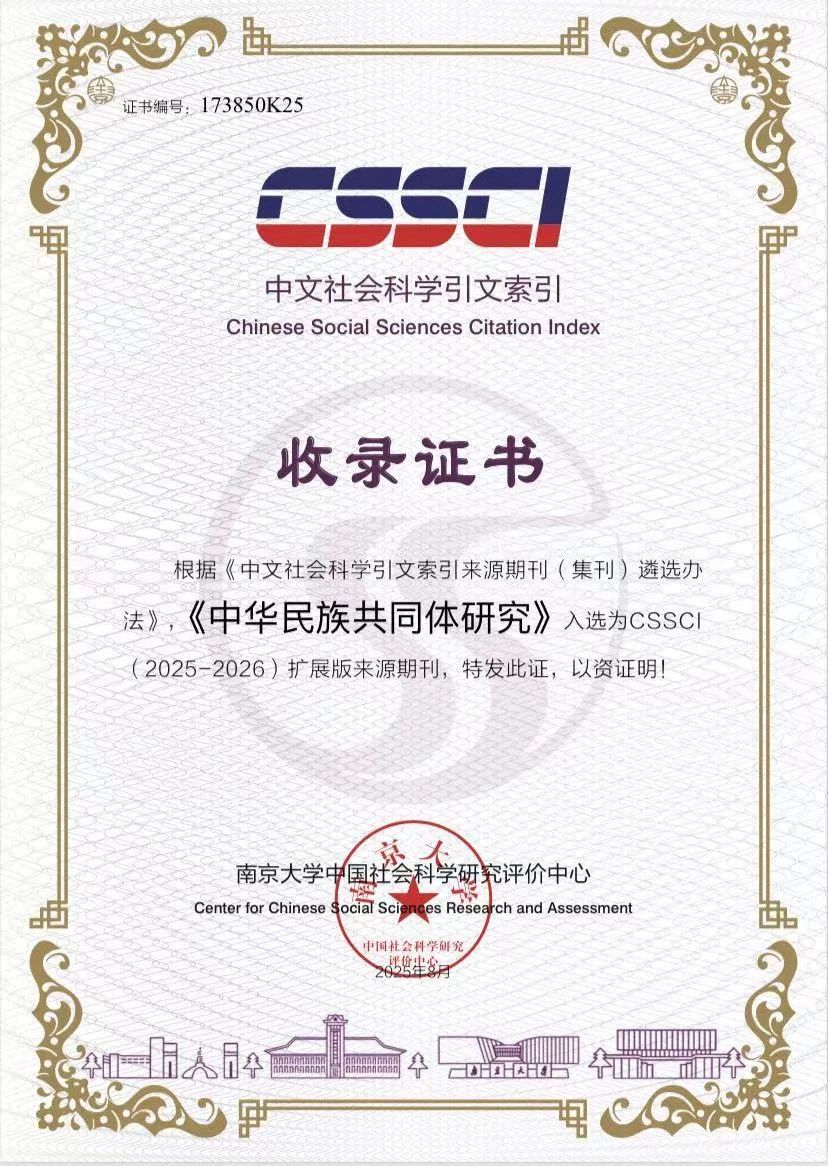 新闻网讯  近日,《中华民族共同体研究》编辑部收到南京大学中国社会科学研究评价中心发来的《CSSCI收录证书》。根据《中文社会科学引文索引来源期刊(集刊)遴选办法》,《中华民族共同体研究》入选为CSSCI(2025-2026)扩展版来源期刊。